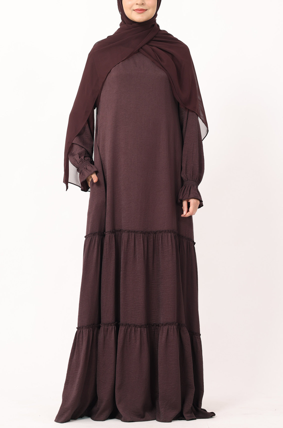 Step into autumn with our Frill Abaya Dress in Rich Mocha Brown, crafted from breezy Hareer Silk fabric that dances with every move. Its feminine frills add a playful touch to a modern chic design, making it the perfect dress for any occasion this season. Comfortable, stylish, and effortlessly charming !